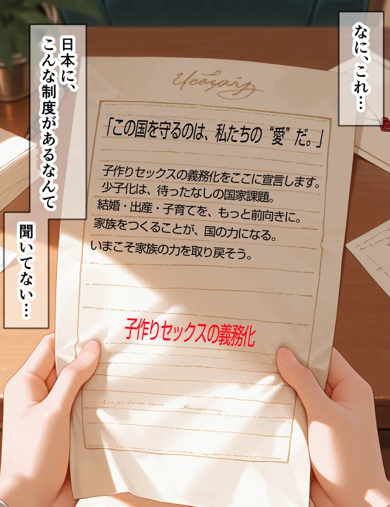 「本日より少子化対策施行。3日以内に孕むように励んでください」