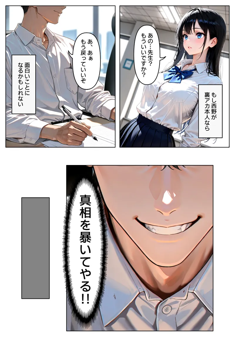 聖職者の仮面を被った悪魔・黒川が、真面目な教え子・西野雫の「淫らな裏の顔」をSNSで特定し、その秘密を凶器として突き付ける! 退学と社会的抹殺の恐怖に顔を歪め、絶望に震える雫の肩を抱きながら、黒川は救済を装った「性愛契約」という名の地獄を宣告する。 それは救いなどではない——優等生のプライドを蹂躙し、その心と体を己の欲望のままに使い倒すための、甘く残忍な「奴隷化」の序章。