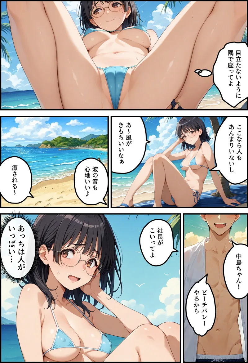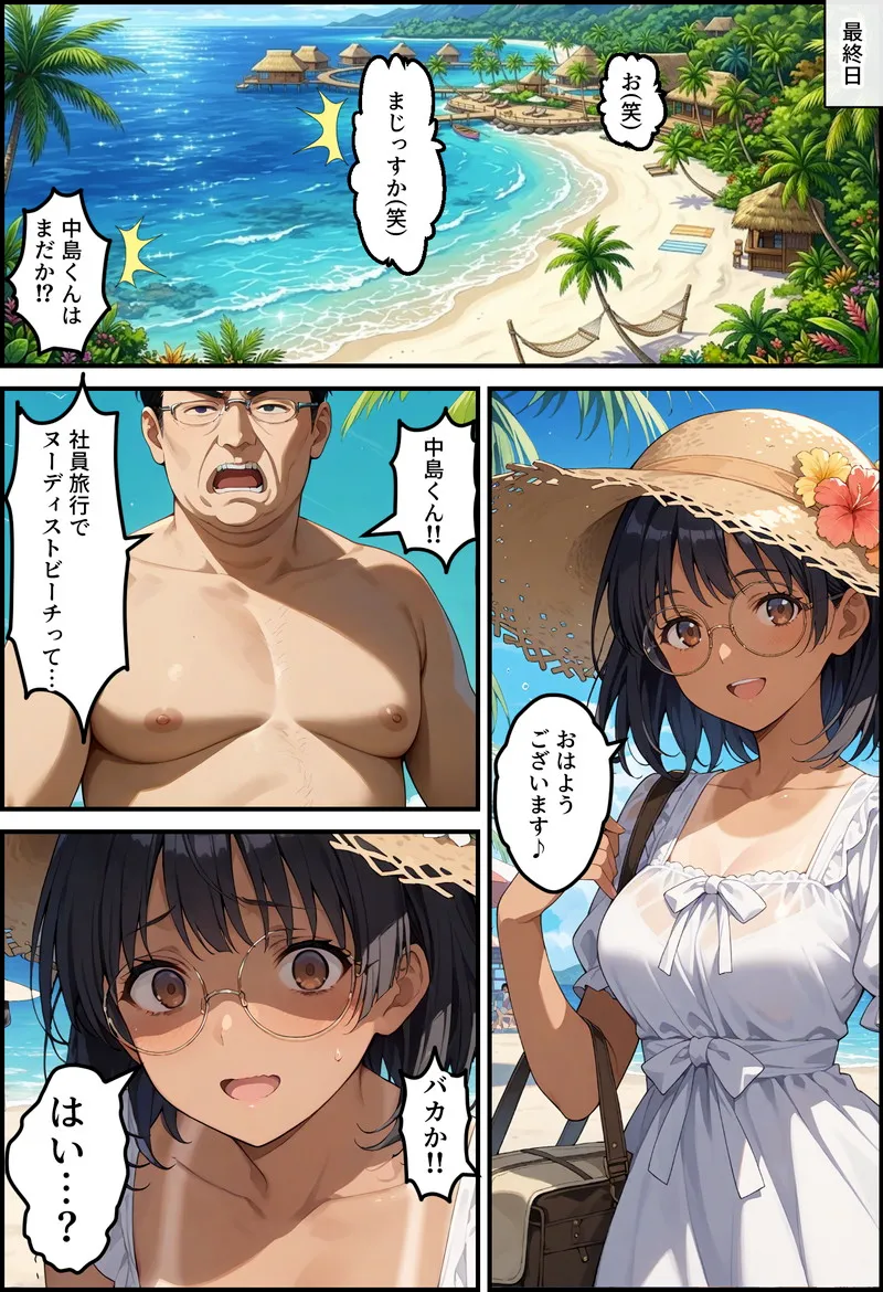 👙 「新人の聖域、一滴残らず完全汚染! 完璧主義な紅一点・事務員ちゃんのプライドが、自ら招いた『ヌーディストビーチ』という無知の毒牙にかかり、理性を焼き切るドロドロの搾精社員旅行へと強制書き換え!」