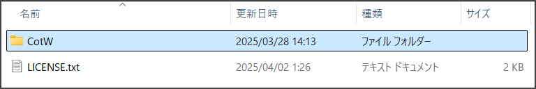 ダウンロードした書庫を解凍して出てきたCotWフォルダをコピー、