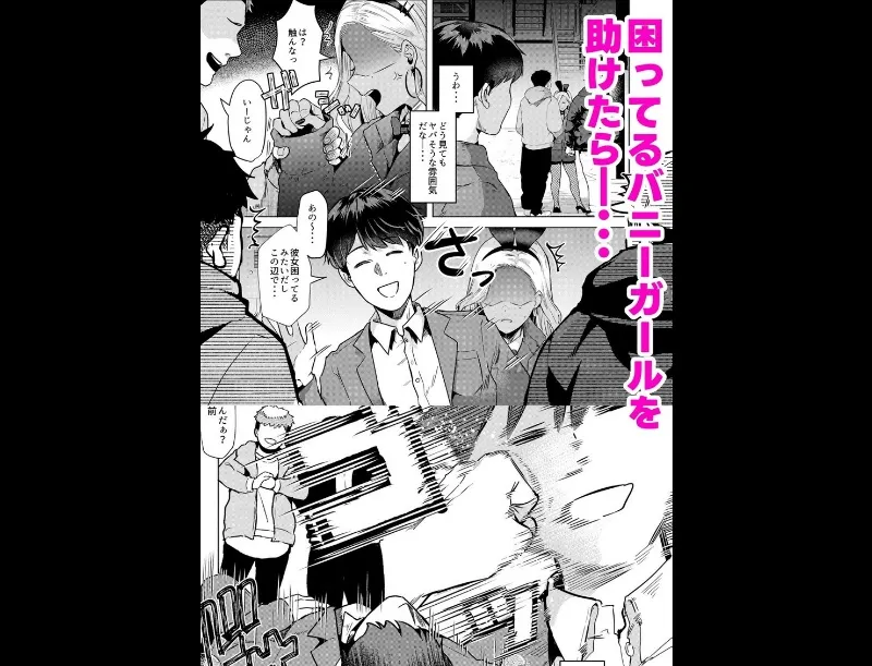 バニーガール姿の女性が、数人の男達に絡まれている。